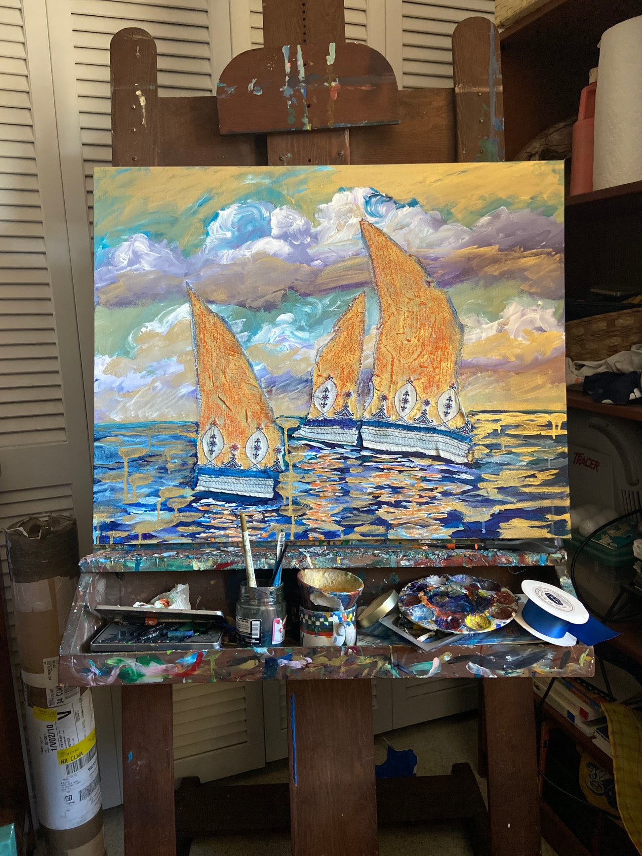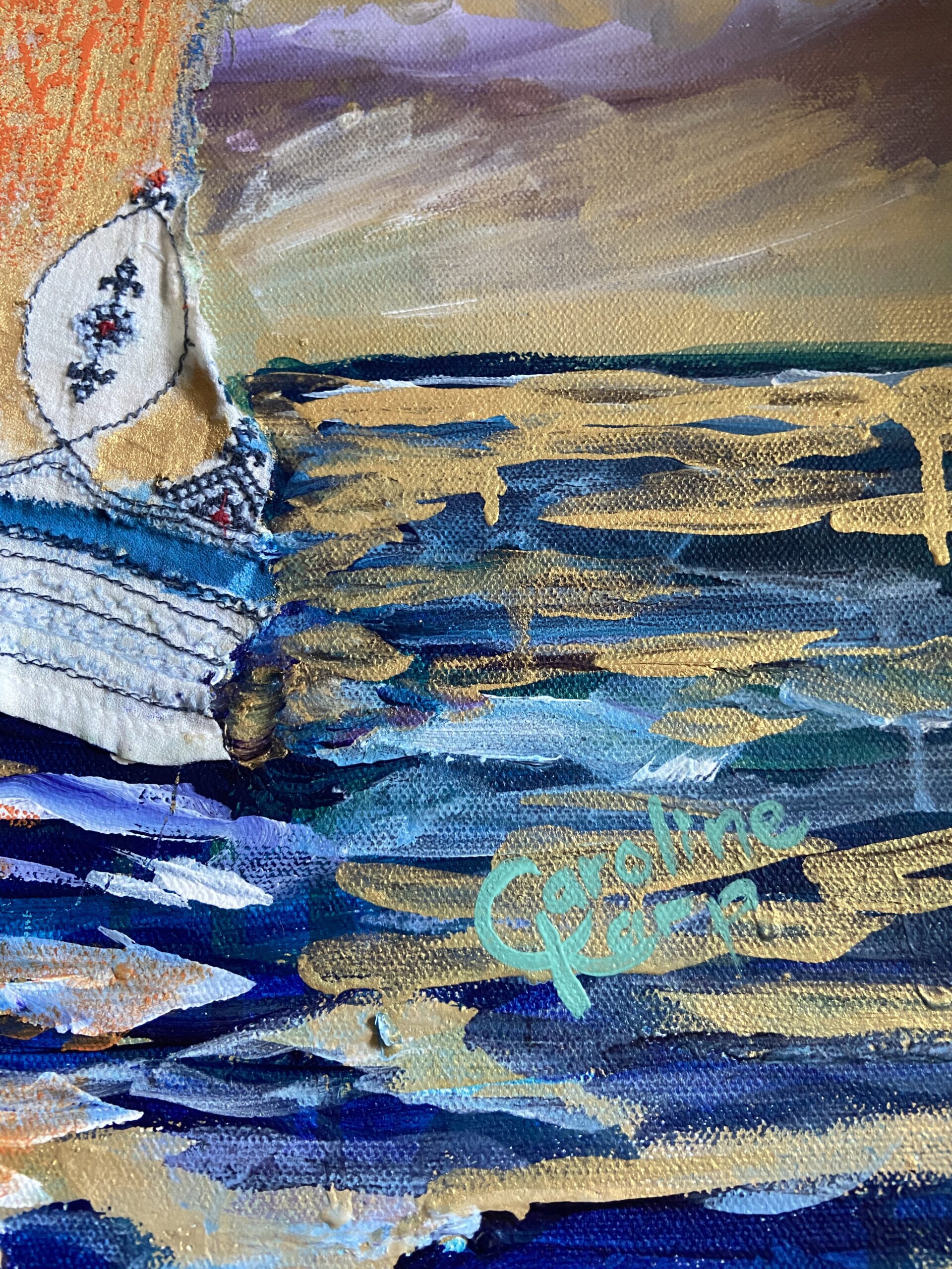 This golden sailboat painting is a mixed media inspired by the quiet drama of wind, water, and sky meeting at sea. The sails are rendered as cotton forms with embroidered edging, catching light as they rise beneath a shifting, golden cloud study.