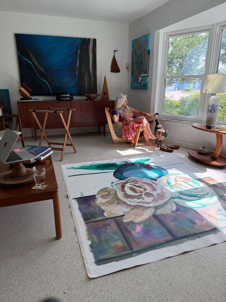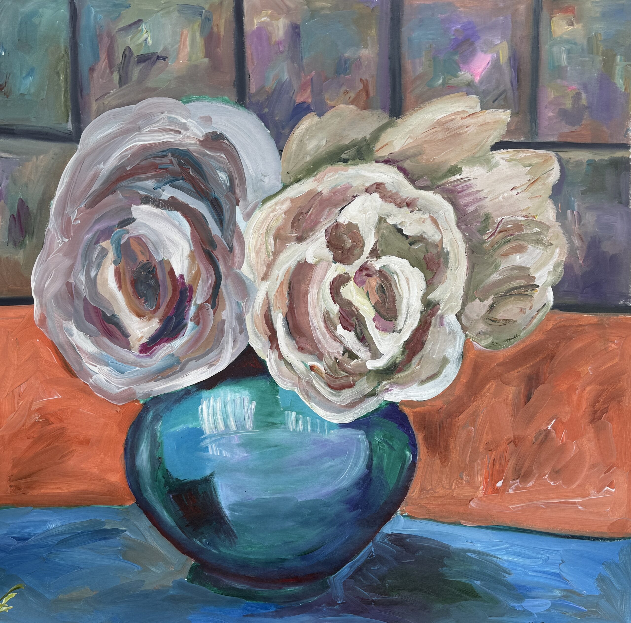 The peonies emerge through intuitive mark-making and layered color, allowing movement to guide the composition rather than strict form.